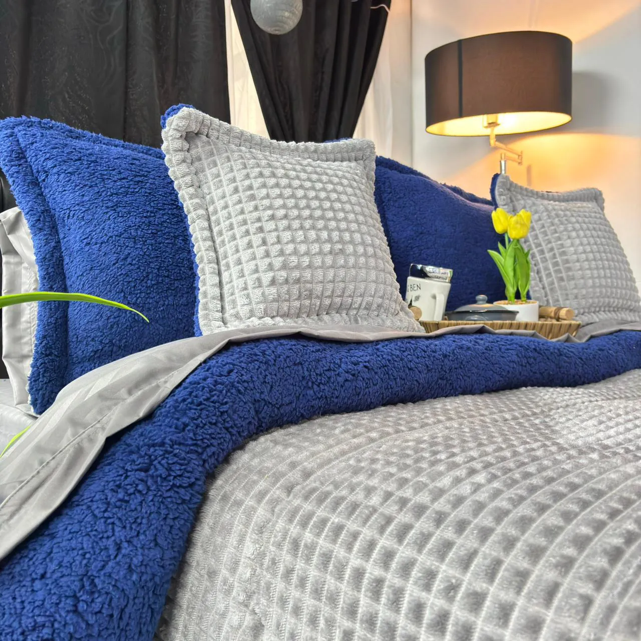 Su textura aterciopelada tipo piel de durazno aporta un acabado elegante y delicado al tacto, mientras que el interior en ovejero garantiza una sensación cálida y acogedora durante las noches frías. El diseño en canales ofrece un estilo moderno y ordenado que realza la decoración de tu cama.