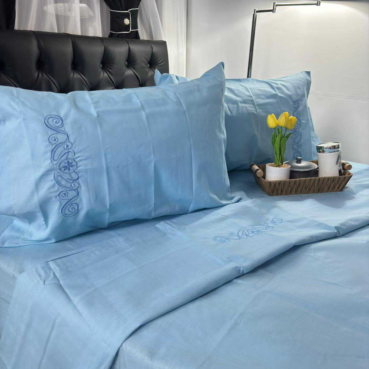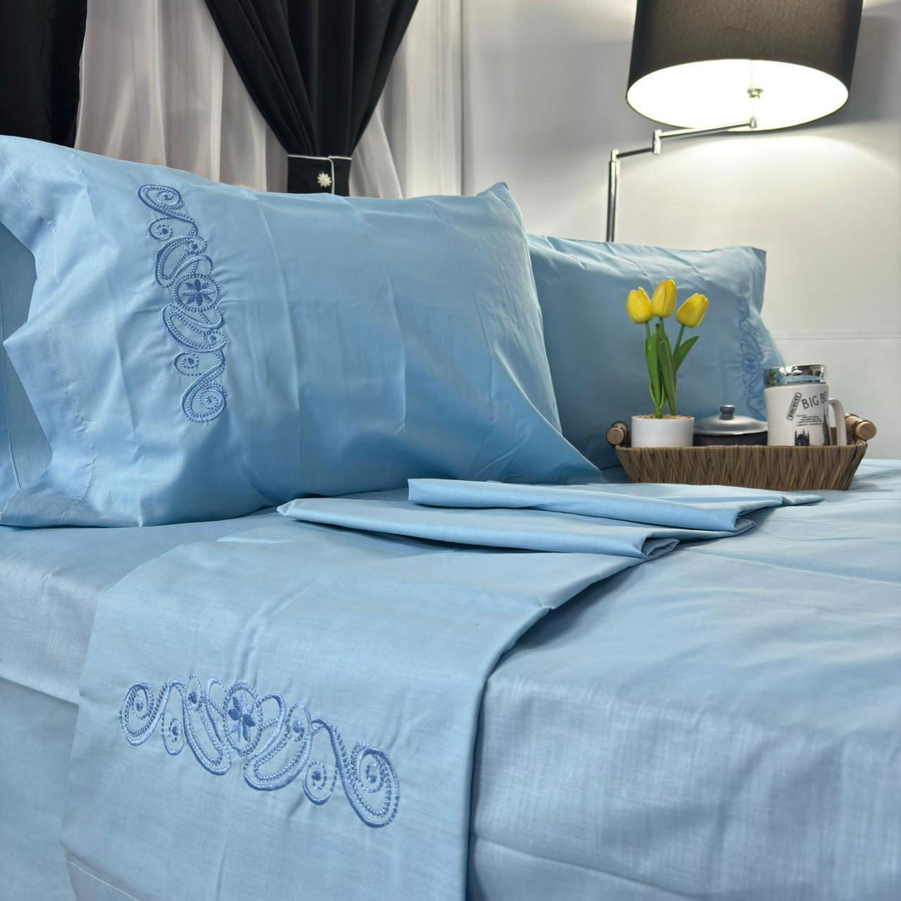 Juego de Sábanas 144 Hilos Bordada Azul Cielo